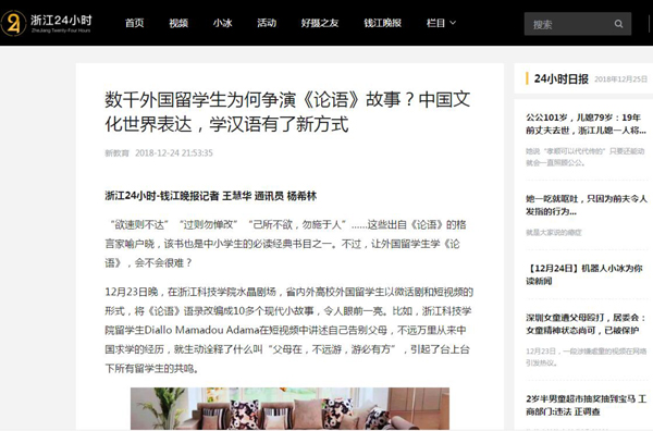 12月23日晚,在浙江科技学院水晶剧场,省内外高校外国留学生以微话剧和短视频的形式,将《论语》语录改编成10多个现代小故事,令人眼前一亮。比如,浙江科技学院留学生Diallo Mamadou Adama在短视频中讲述自己告别父母,不远万里从来中国求学的经历,就生动诠释了什么叫“父母在,不远游,游必有方”,引起了台上台下所有留学生的共鸣。