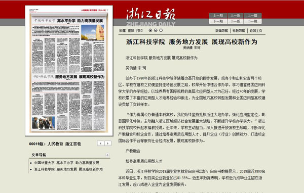 “作为省属公办普通本科高校,我们始终坚持扎根浙江大地办学,强化应用型定位,彰显国际化特色,主动融入浙江区域经济社会发展重大战略,不断提升学校办学实力。”浙江科技学院校长赵东福教授说。近年来,学校主动担当,深入推进开放强校主战略,不断深化产教融合和校企合作,通过培养高素质应用型人才、提升企业(行业)创新能力、打造校企国际合作平台等服务社会经济发展,展现高校新作为。