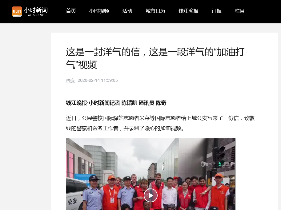 近日,公民警校国际驿站志愿者米莱等国际志愿者给上城公安写来了一份信,致敬一线的警察和医务工作者,并录制了暖心的加油视频。