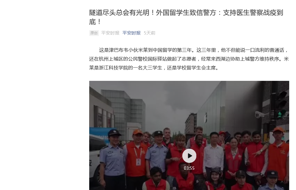 原文链接:隧道尽头总会有光明!外国留学生致信警方:支持医生警察战疫到底!