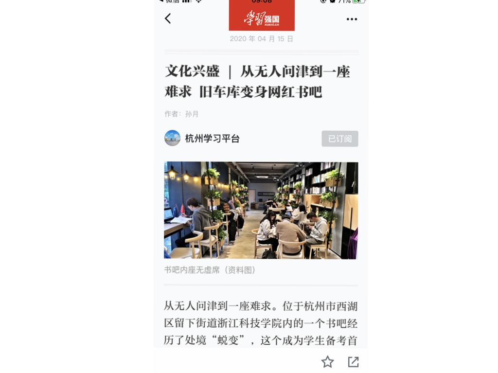 从无人问津到一座难求。位于杭州市西湖区留下街道浙江科技学院内的一个书吧经历了处境“蜕变”,这个成为学生备考首选地的网红书吧,是一个由原先脏乱差的破旧自行车库改造而来的。