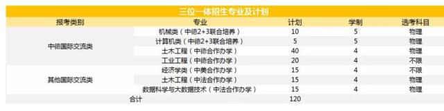 2020年,该校“三位一体”计划120人,招生专业主打国际牌,打造与德国、法国、美国等发达国家高等教育的立交桥,主要有:
