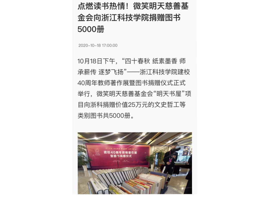 10月18日下午,“四十春秋 纸素墨香 师承薪传 逐梦飞扬”——浙江科技学院建校40周年教师著作展暨图书捐赠仪式正式举行,微笑明天慈善基金会“明天书屋”项目向浙科捐赠价值25万元的文史哲工等类别图书共5000册。