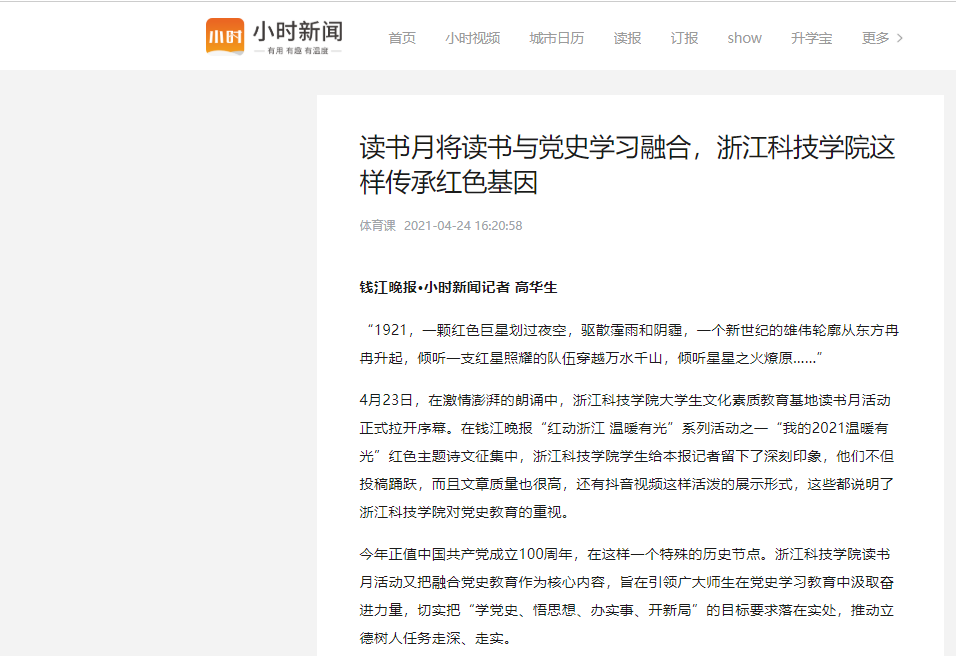 4月23日,在激情澎湃的朗诵中,浙江科技学院大学生文化素质教育基地读书月活动正式拉开序幕。在钱江晚报“红动浙江 温暖有光”系列活动之一“我的2021温暖有光”红色主题诗文征集中,浙江科技学院学生给本报记者留下了深刻印象,他们不但投稿踊跃,而且文章质量也很高,还有抖音视频这样活泼的展示形式,这些都说明了浙江科技学院对党史教育的重视。