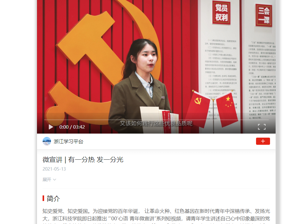 “知史爱党,知史爱国。”为迎接党的百年华诞, 让革命火种、红色基因在新时代青年中深植传承、发扬光大,浙江科技学院推出 “‘00’心语 青年微宣讲”系列短视频,请青年学生讲述自己心中印象最深的党的故事、革命的故事、英雄的故事、发展的故事,让“00后”带动“00后”一起品读百年党史,读懂中国近现代以来最为可歌可泣的篇章,读出重点,读出味道。