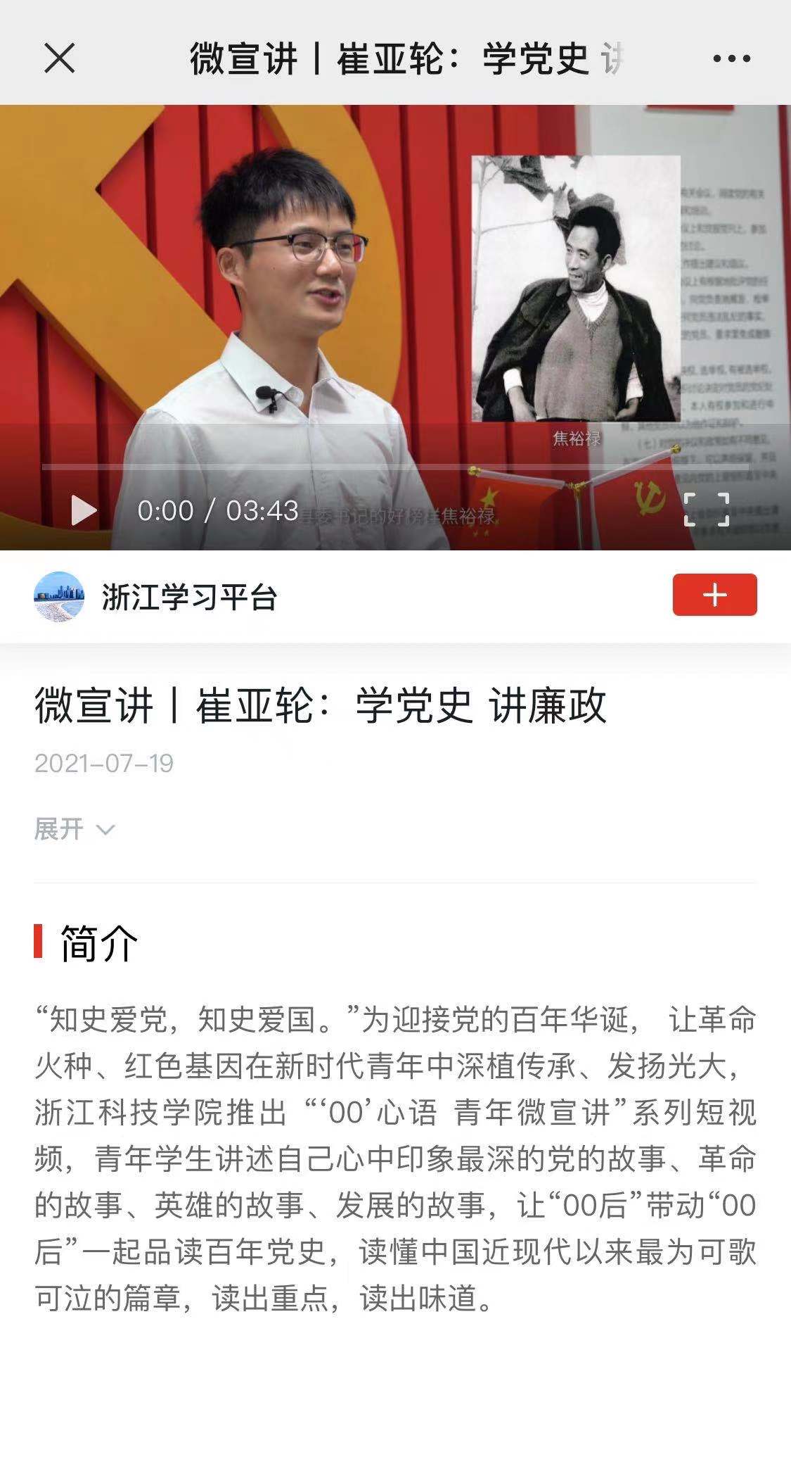“知史爱党,知史爱国。”为迎接党的百年华诞, 让革命火种、红色基因在新时代青年中深植传承、发扬光大,浙江科技学院推出 “‘00’心语 青年微宣讲”系列短视频,青年学生讲述自己心中印象最深的党的故事、革命的故事、英雄的故事、发展的故事,让“00后”带动“00后”一起品读百年党史,读懂中国近现代以来最为可歌可泣的篇章,读出重点,读出味道。