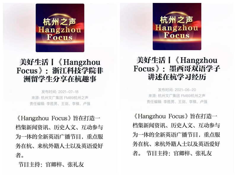 《Hangzhou Focus》旨在打造一档集新闻资讯、历史人文、互动参与为一体的全新英语广播节目,重点服务在杭、来杭外籍人士以及英语爱好者。近日,申搏2位留学生受邀参加节目,讲述在杭学习生活经历。