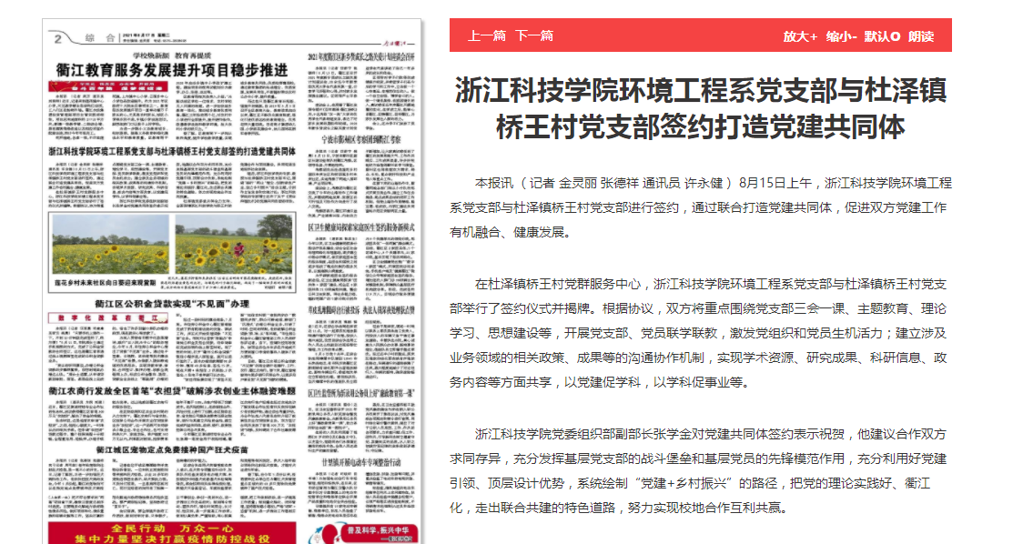 8月15日上午,浙江科技学院环境工程系党支部与杜泽镇桥王村党支部进行签约,通过联合打造党建共同体,促进双方党建工作有机融合、健康发展。