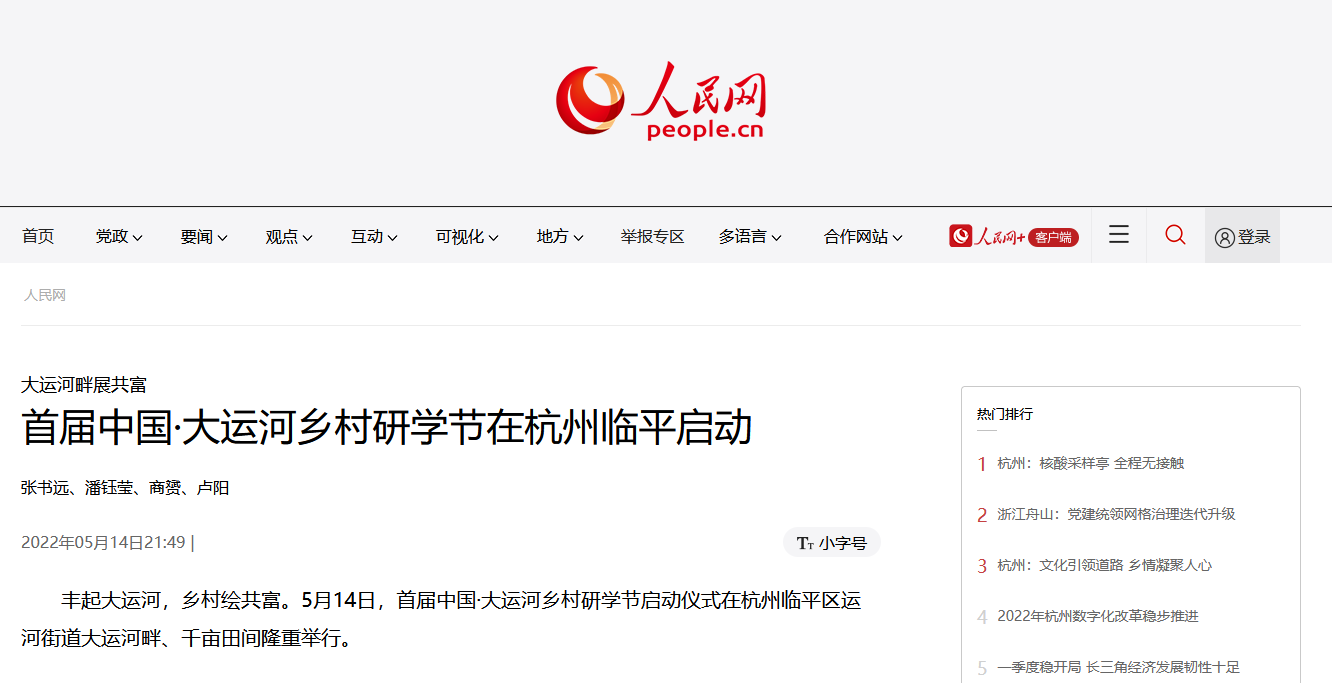 5月14日,人民网刊发《大运河畔展共富首届中国·大运河乡村研学节在杭州临平启动》一文,报道首届中国·大运河乡村研学节启动仪式。关注申搏人文学院和临平区新宇村共同发布“农文旅设计与运营”研学课程,打造新宇村红色文化和精品路线,推动大运河文化遗产和运河水乡文化的传播。