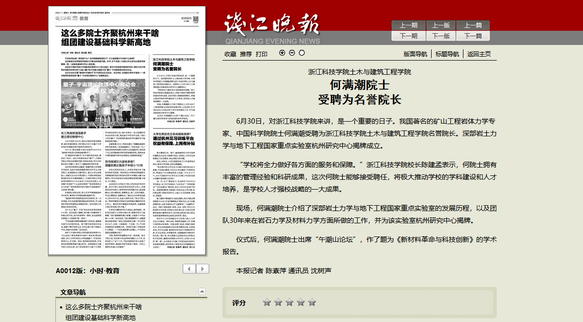 6月30日,对浙江科技学院来讲,是一个重要的日子。我国著名的矿山工程岩体力学专家、中国科学院院士何满潮受聘为浙江科技学院土木与建筑工程学院名誉院长。深部岩土力学与地下工程国家重点实验室杭州研究中心揭牌成立。