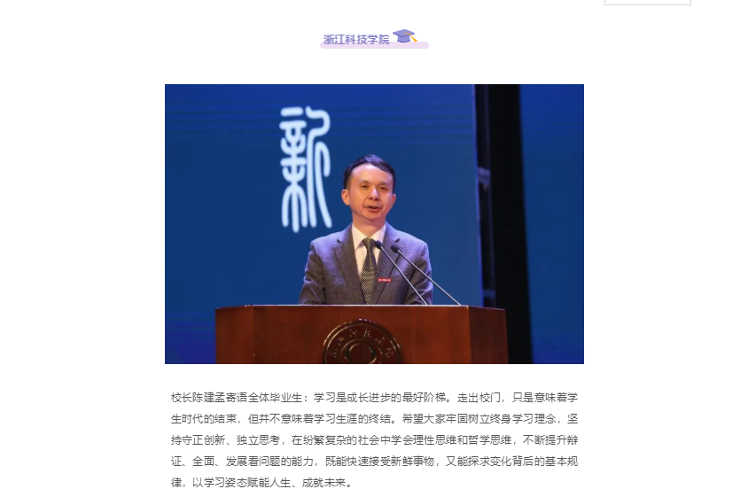 校长陈建孟寄语全体毕业生:学习是成长进步的最好阶梯。走出校门,只是意味着学生时代的结束,但并不意味着学习生涯的终结。希望大家牢固树立终身学习理念,坚持守正创新、独立思考,在纷繁复杂的社会中学会理性思维和哲学思维,不断提升辩证、全面、发展看问题的能力,既能快速接受新鲜事物,又能探求变化背后的基本规律,以学习姿态赋能人生、成就未来。