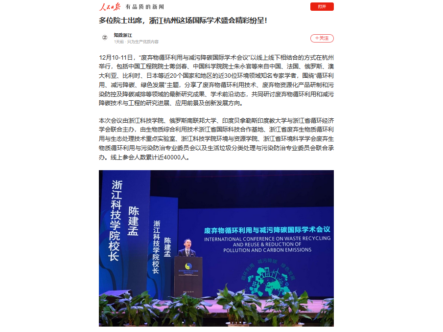 12月10-11日,“废弃物循环利用与减污降碳国际学术会议”以线上线下相结合的方式在杭州举行,包括中国工程院院士蒋剑春、中国科学院院士朱永官等来自中国、法国、俄罗斯、澳大利亚、比利时、日本等近20个国家和地区的近30位环境领域知名专家学者,围绕“循环利用、减污降碳、绿色发展”主题,分享了废弃物循环利用技术、废弃物资源化产品研制和污染防控及降碳减排等领域的最新研究成果、学术前沿动态,共同研讨废弃物循环利用和减污降碳技术与工程的研究进展、应用前景及创新发展方向。