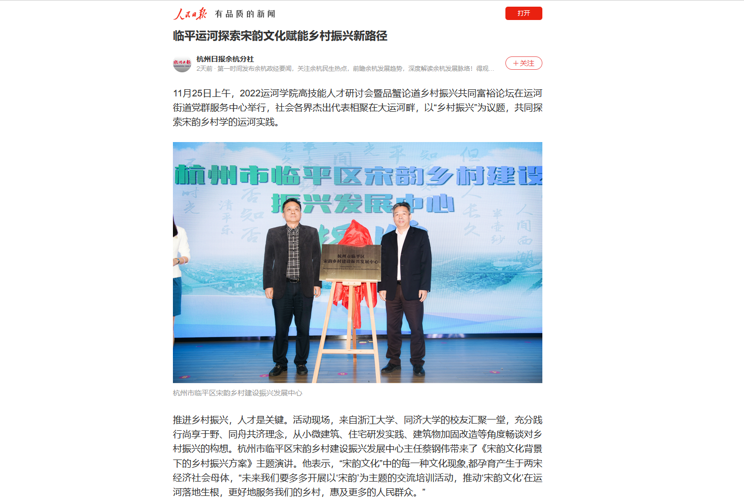 11月25日,由申搏土木与建筑工程学院支持建设的2022运河学院高技能人才研讨会暨品蟹论道乡村振兴共同富裕论坛举行,人民日报新媒体平台以《临平运河探索宋韵文化赋能乡村振兴新路径》为题,对该活动进行报道。原文链接:临平运河探索宋韵文化赋能乡村振兴新路径