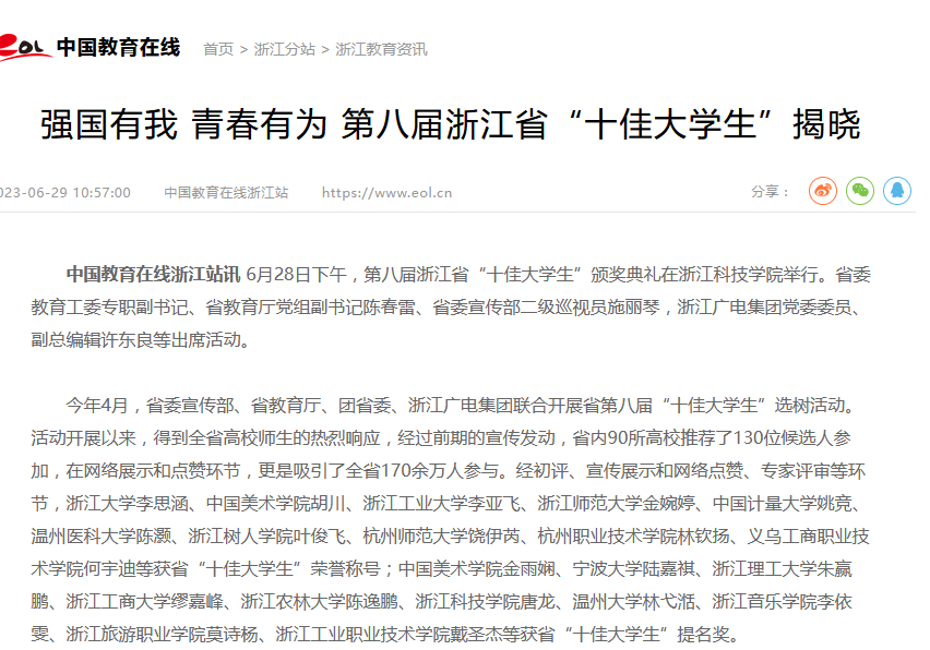 杭州网:他们是浙江“十佳大学生”!你认识吗?