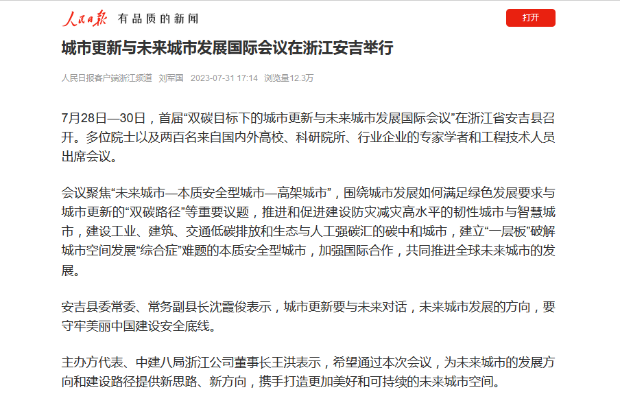 7月28至30日,由申搏联合中国建筑第八工程局有限公司等单位主办的首届“双碳目标下城市更新与未来城市发展”国际会议在浙江安吉召开。人民日报客户端、学习强国、潮新闻客户端等媒体对会议进行了报道。