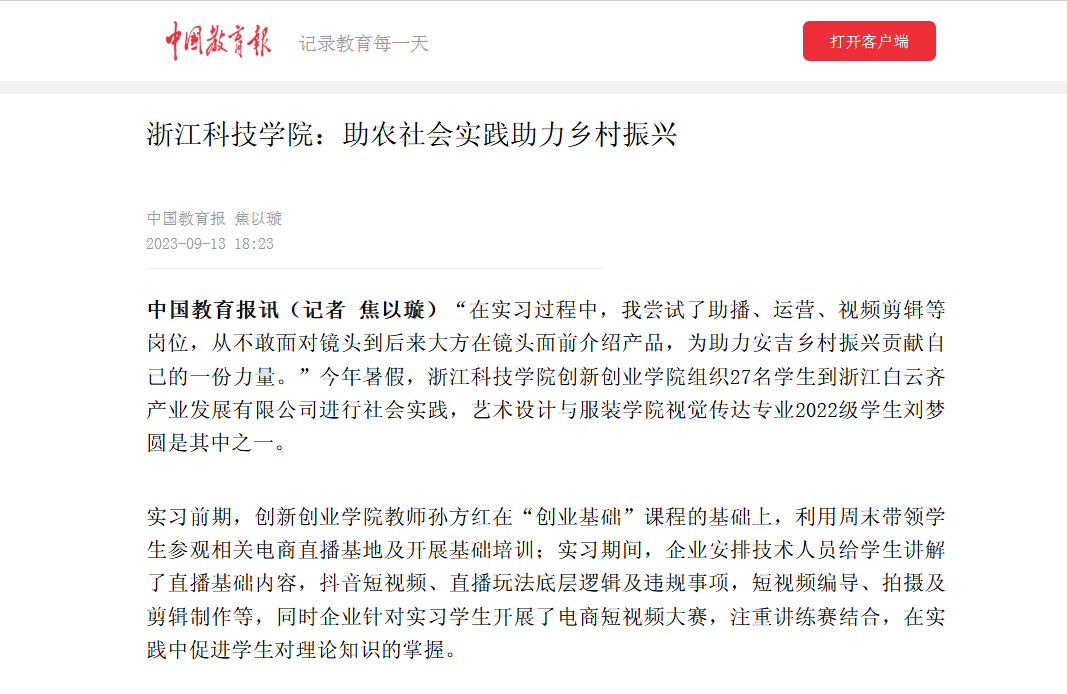 “在实习过程中,我尝试了助播、运营、视频剪辑等岗位,从不敢面对镜头到后来大方在镜头面前介绍产品,为助力安吉乡村振兴贡献自己的一份力量。”今年暑假,浙江科技学院创新创业学院组织27名学生到浙江白云齐产业发展有限公司进行社会实践,艺术设计与服装学院视觉传达专业2022级学生刘梦圆是其中之一。
