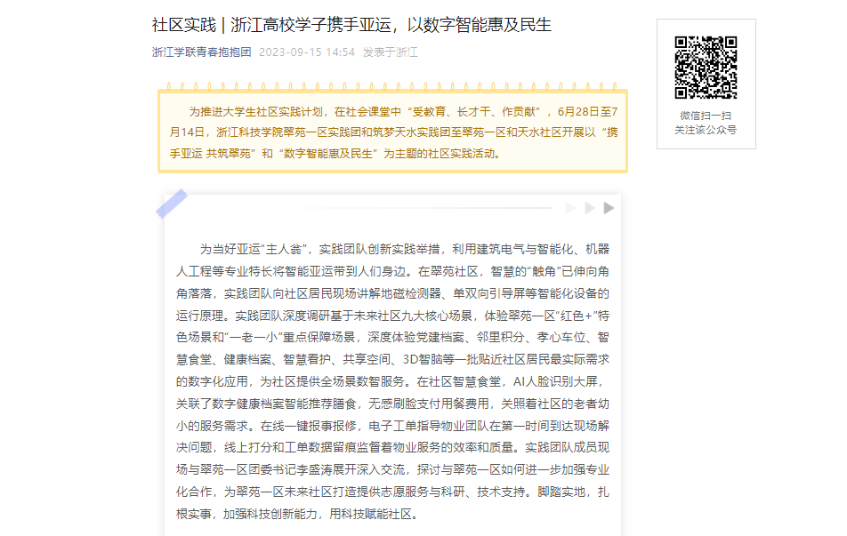为当好亚运“主人翁”,实践团队创新实践举措,利用建筑电气与智能化、机器人工程等专业特长将智能亚运带到人们身边。在翠苑社区,智慧的“触角”已伸向角角落落,实践团队向社区居民现场讲解地磁检测器、单双向引导屏等智能化设备的运行原理。实践团队深度调研基于未来社区九大核心场景,体验翠苑一区“红色+”特色场景和“一老一小”重点保障场景,深度体验党建档案、邻里积分、孝心车位、智慧食堂、健康档案、智慧看护、共享空间、3D智脑等一批贴近社区居民最实际需求的数字化应用,为社区提供全场景数智服务。在社区智慧食堂,AI人脸识别大屏,关联了数字健康档案智能推荐膳食,无感刷脸支付用餐费用,关照着社区的老者幼小的服务需求。在线一键报事报修,电子工单指导物业团队在第一时间到达现场解决问题,线上打分和工单数据留痕监督着物业服务的效率和质量。实践团队成员现场与翠苑一区团委书记李盛涛展开深入交流,探讨与翠苑一区如何进一步加强专业化合作,为翠苑一区未来社区打造提供志愿服务与科研、技术支持。脚踏实地,扎根实事,加强科技创新能力,用科技赋能社区。