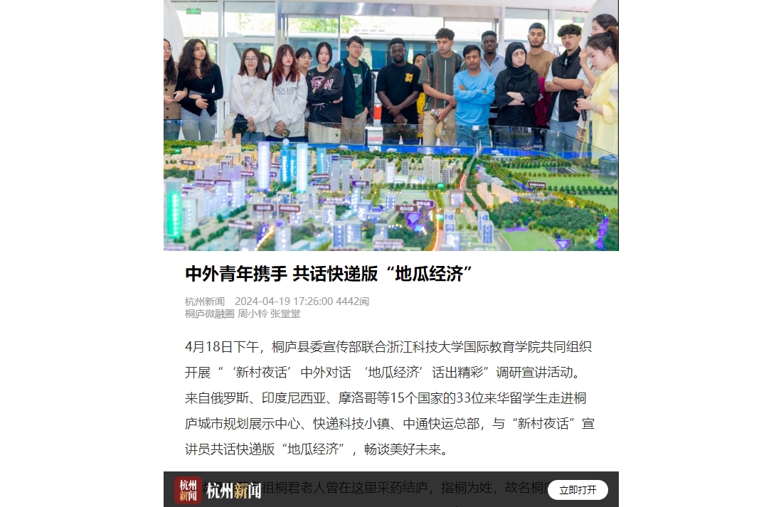 4月18日下午,桐庐县委宣传部联合SUNBET申搏国际教育学院共同组织开展“‘新村夜话’中外对话 ‘地瓜经济’话出精彩”调研宣讲活动。来自俄罗斯、印度尼西亚、摩洛哥等15个国家的33位来华留学生走进桐庐城市规划展示中心、快递科技小镇、中通快运总部,与“新村夜话”宣讲员共话快递版“地瓜经济”,畅谈美好未来。