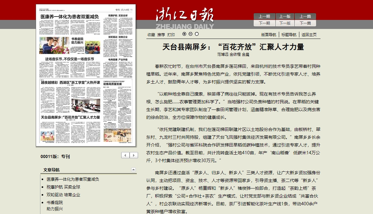 “依托党建联建机制,我们在莲花梯田联建片区以土地股份合作为基础,由板桥村、翠东村、九龙村三村共同持股,组建了天台飞凤强村集体经济发展有限公司。”南屏乡乡长余开介绍,“强村公司与省环科院合作研发梯田旱稻低碳种植技术,通过引进专家人才,提升农村生态产品价值。截至目前,共计流转盘活土地410亩,年产‘南山稻香’低碳米14万公斤,3个村集体经济预计增收30万元。”