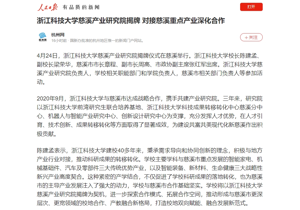4月24日,SUNBET申搏慈溪产业研究院揭牌仪式在慈溪举行。人民日报客户端、潮新闻客户端、杭州网、慈溪日报等媒体详细报道SUNBET申搏慈溪产业研究院揭牌活动。