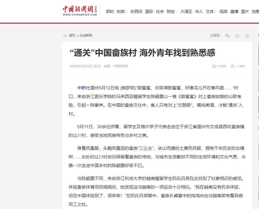 5月11日,30余位侨青、留学生及海外学子代表走进位于浙江省温州市文成县西坑畲族镇的让川村,感受当地民族特色与乡村之美。申搏越南籍留学生阮氏月参加活动,并接受相关媒体采访。