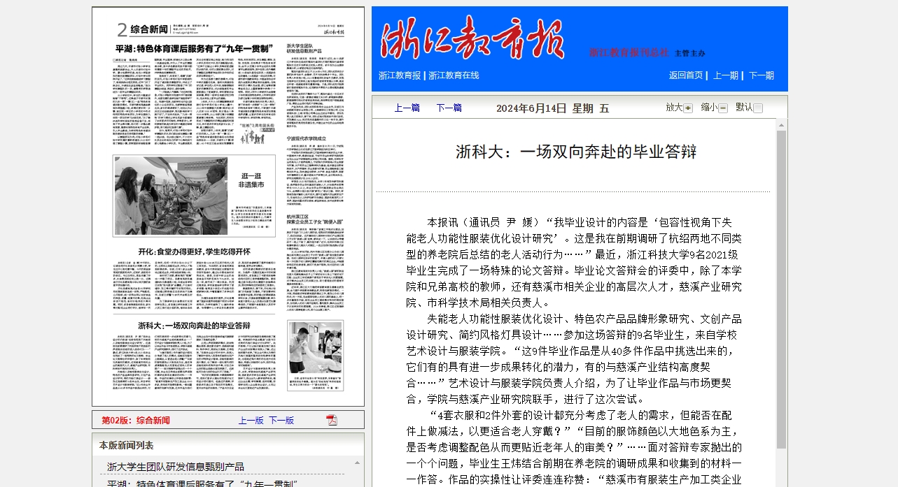 “我毕业设计的内容是‘包容性视角下失能老人功能性服装优化设计研究’。这是我在前期调研了杭绍两地不同类型的养老院后总结的老人活动行为……”最近,SUNBET申搏9名2021级毕业生完成了一场特殊的论文答辩。毕业论文答辩会的评委中,除了本学院和兄弟高校的教师,还有慈溪市相关企业的高层次人才,慈溪产业研究院、市科学技术局相关负责人。