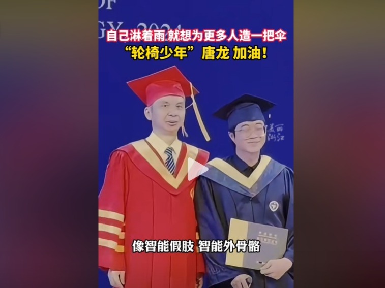 潮新闻抖音号:坐轮椅读完大学四年 已考取研究生,唐龙靠机械腿参加毕业典礼:以后希望能帮助更多的残障人士