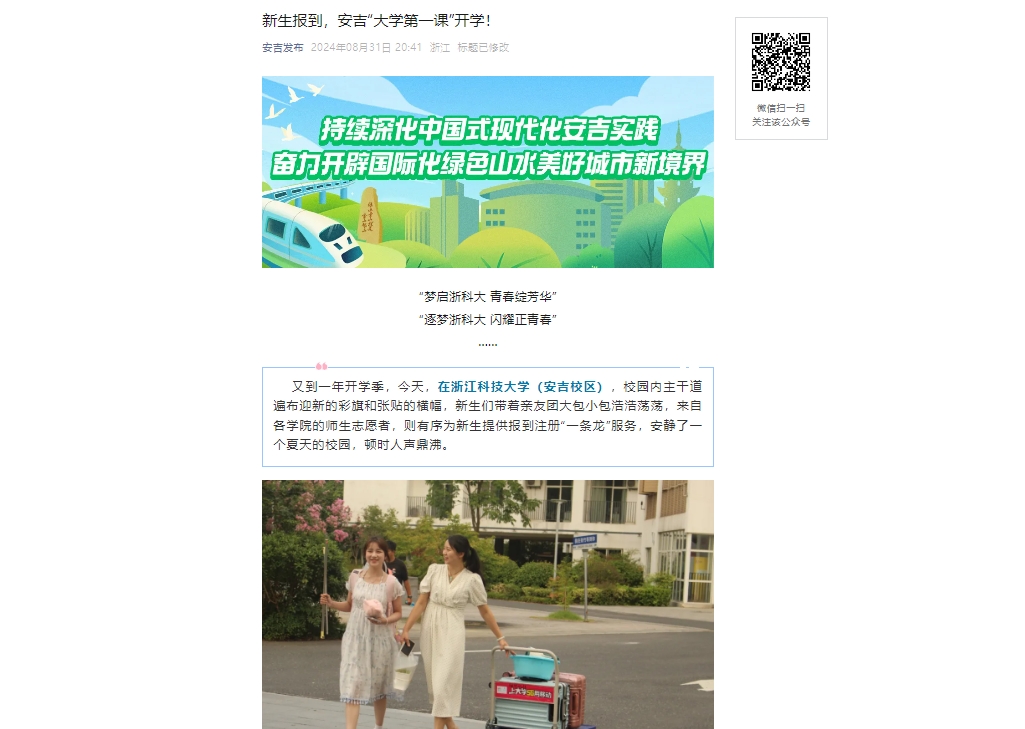 8月30日,学校迎来了2024级本科新生。安静了一个夏天的校园,顿时人声鼎沸。安吉发布、爱安吉客户端等媒体对2024级新生报到进行了报道。