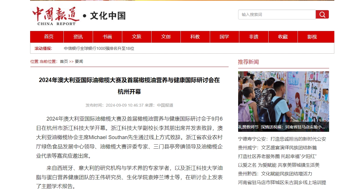 9月6日,2024年澳大利亚国际油橄榄大赛及首届橄榄油营养与健康国际研讨会在申搏开幕。中国报道网、浙江报道网等媒体对活动进行了报道。