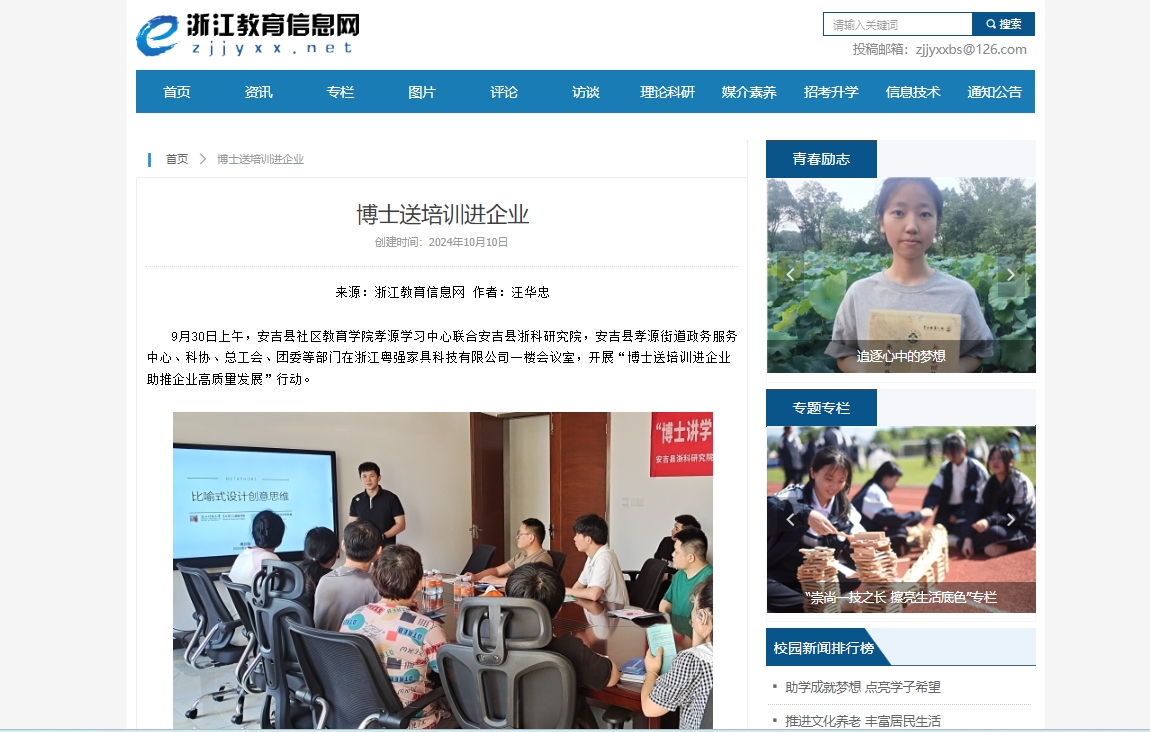 9月30日上午,安吉县社区教育学院孝源学习中心联合安吉县浙科研究院,安吉县孝源街道政务服务中心、科协、总工会、团委等部门在浙江粤强家具科技有限公司一楼会议室,开展“博士送培训进企业 助推企业高质量发展”行动。