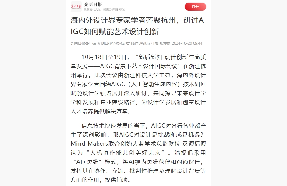 光明日报客户端:海内外设计界专家学者齐聚杭州,研讨AIGC如何赋能艺术设计创新