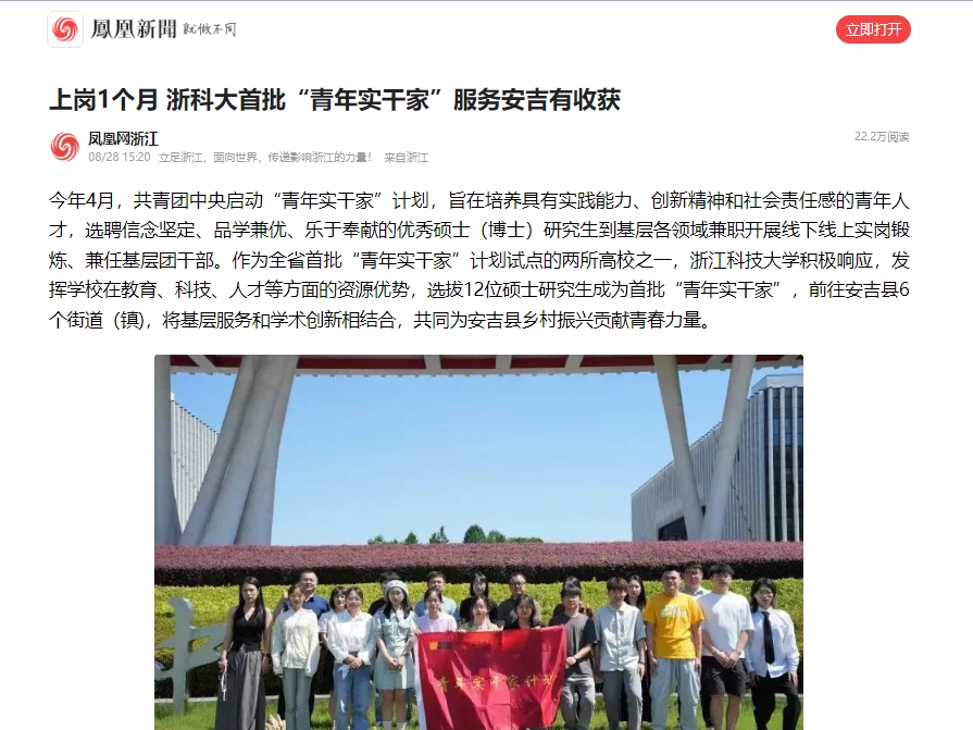 今年4月,共青团中央启动“青年实干家”计划,旨在培养具有实践能力、创新精神和社会责任感的青年人才,选聘信念坚定、品学兼优、乐于奉献的优秀硕士(博士)研究生到基层各领域兼职开展线下线上实岗锻炼、兼任基层团干部。作为全省首批“青年实干家”计划试点的两所高校之一,SUNBET申搏积极响应,发挥学校在教育、科技、人才等方面的资源优势,选拔12位硕士研究生成为首批“青年实干家”,前往安吉县6个街道(镇),将基层服务和学术创新相结合,共同为安吉县乡村振兴贡献青春力量。
