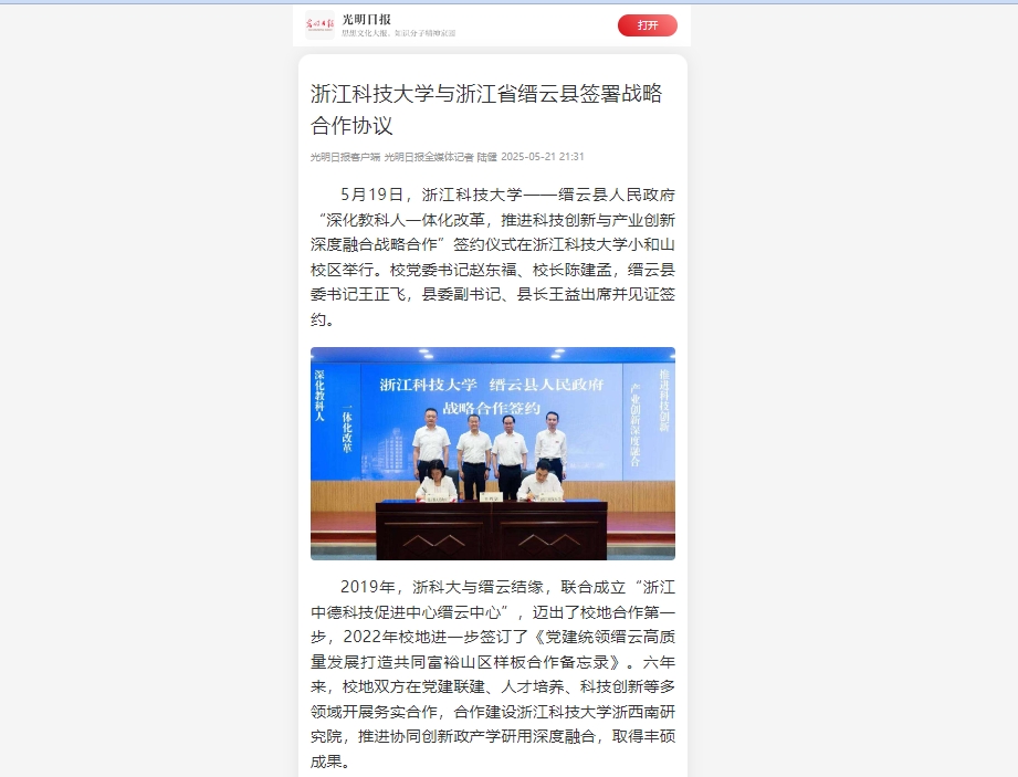 光明日报客户端:SUNBET申搏与浙江省缙云县签署战略合作协议