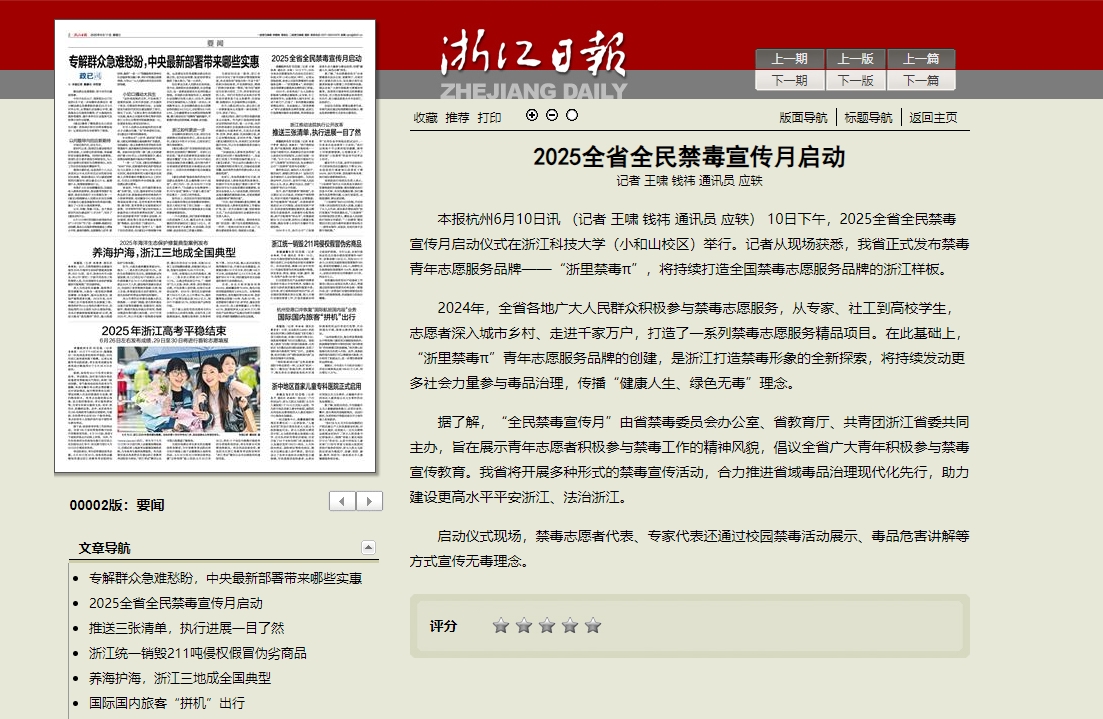 浙江日报:2025全省全民禁毒宣传月启动
