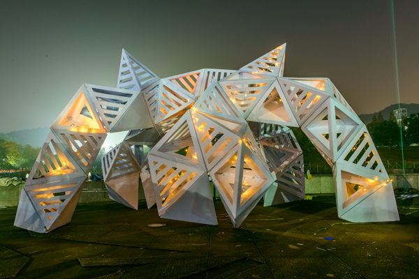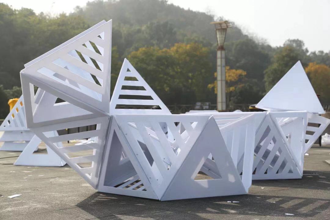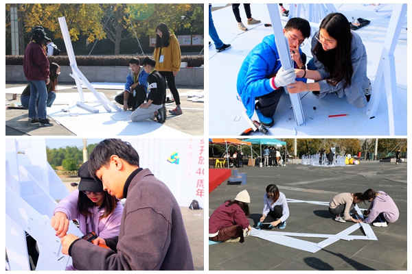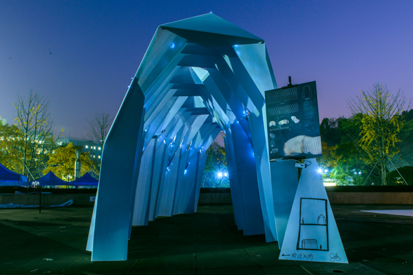 建筑学16级“Z的六次方”团队他们设计一个“移动的城堡”。设计师张婧雯介绍说,“为了在有限材料空间内容纳更多的人,我们想到这样的折叠设计,专业用语叫‘折叠蛇腹板基’,利用伸缩性使长度可以调节,内部空间也更加自由灵活。此外,板基的纹理变换多样层层叠叠,又兼具美观性。”城乡规划15级暨思思小组的作品名叫《星空》,暨思思表示,作品的灵感来自奶茶包装上的六边形《星空》单体用五角星和五边形,再由单体组合成一个多边形,而中构件是一个类似棉花状的半球形,最大的特色就是每个小部件的形状都是不一样的,在光亮的照射下会有不同的光影效果。建筑学17级钱佳峰小组的作品是《生长》,设计灵感来自水晶剧院,钱佳峰表示,以前的作业都是画纸上或者电脑上,没有过像这次这样的实践机会。这是一个难得的体验,切身的体会,真实的空间感受,使得每位小组成员更专业化,同时关系也变得亲密。