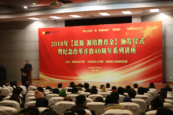 12月14日晚,【思源-源培教育金】颁奖仪式暨改革开放40周年系列讲座在西图报告厅举行,副校长冯军,民建浙江省委会办公室主任钟红华、民建省直四支部主委黄炜出席活动。