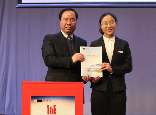 (2018年12月20日举行的第五届大学生学术诚信宣誓仪式,校长赵东福接受学生代表签署的“学术诚信承诺书”)