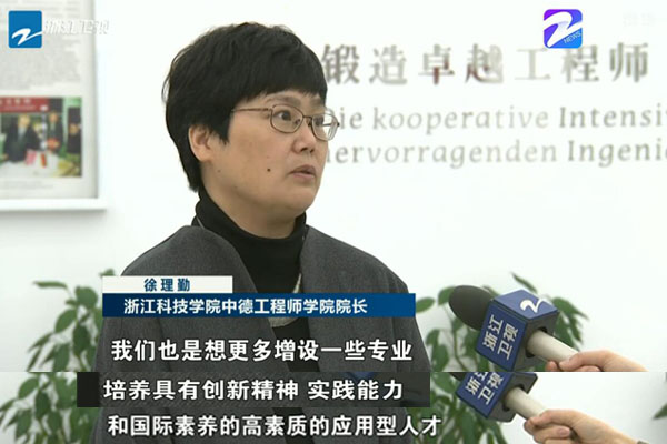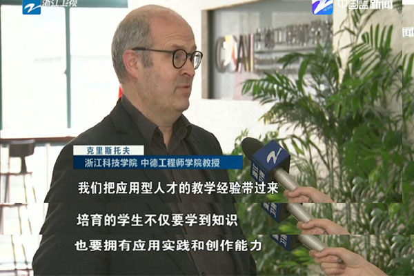 当日,浙江卫视新闻联播报道了全省教育大会新闻,关注浙江高等教育如何培养更多高素质人才,更好服务经济发展。新闻以申搏彰显国际化特色,培养高素质应用型人才的探索为例,并采访了中德工程师学院院长徐理勤教授和德方专家、吕贝克应用科技大学克里斯托夫教授(视频链接:https://newsapp.cztv.com/video/index.jsp?c=5811069#)。徐理勤介绍了申搏与德国高校合作的历程,中德工程师学院的人才培养模式等。她表示,学习借鉴德国高校的应用型人才培养经验,培养更多高素质应用型人才,才能更好地为浙江经济转型升级服务。