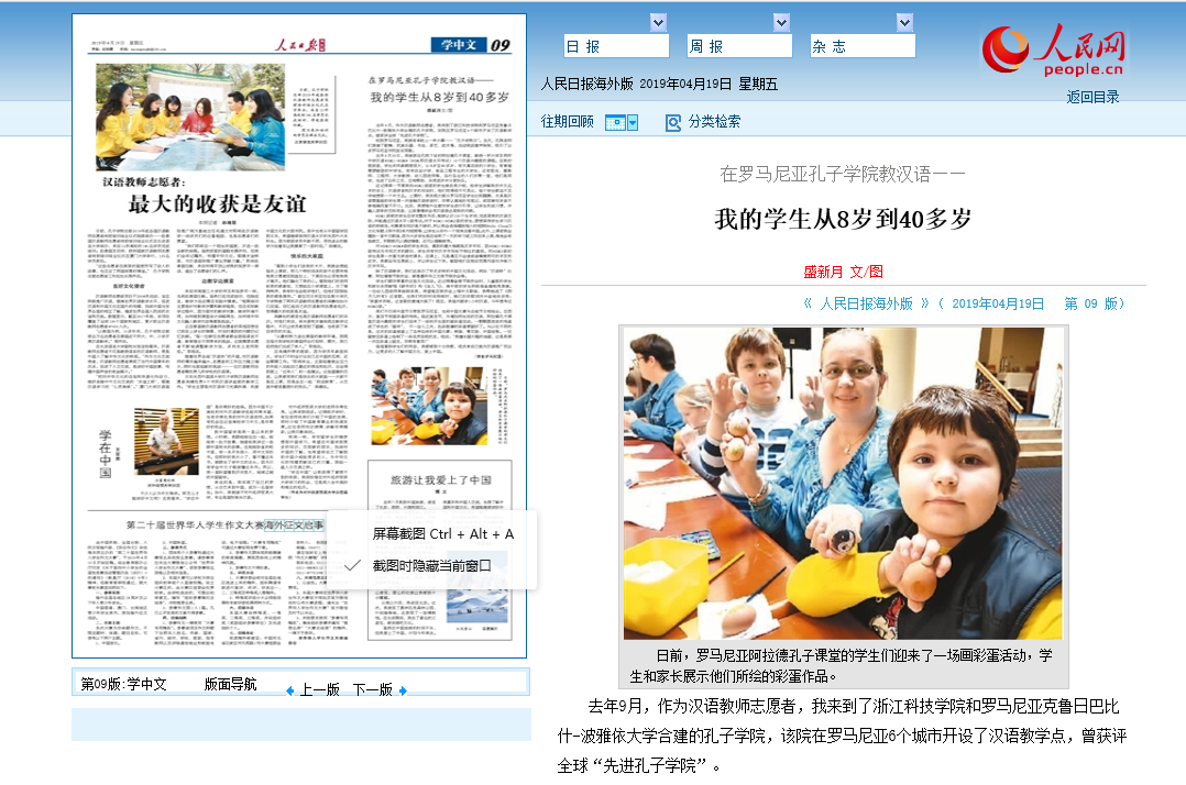 4月19日出版的人民日报海外版刊登《在罗马尼亚孔子学院教汉语——我的学生从8岁到40多岁》一文,这是申搏罗马尼亚克鲁日孔院教师志愿者盛新月(上图二中)根据自己从事孔院志愿者工作的经历所写的。盛新月是申搏16级汉语国际教育专业硕士,2017年7通过国家汉办选拔赴印尼八华学校(印尼最大的三语国际学校)担任志愿者,去年9月前往克鲁日孔子学院任汉语教师。