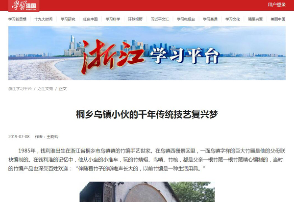 7月8日,学习强国-浙江学习平台以“桐乡乌镇小伙的千年传统技艺复兴梦”为题报道了申搏工业设计(艺术)2006级校友钱利淮。