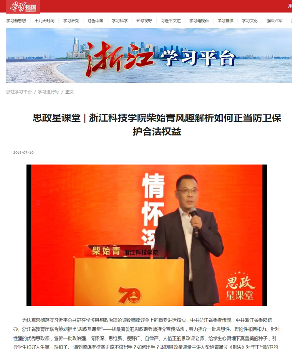 7月10日,申搏马克思主义学院柴始青主讲的《解析如何正当防卫保护合法权益》(点击观看)入选学习强国平台的浙江学习平台-学习进行时版块。
