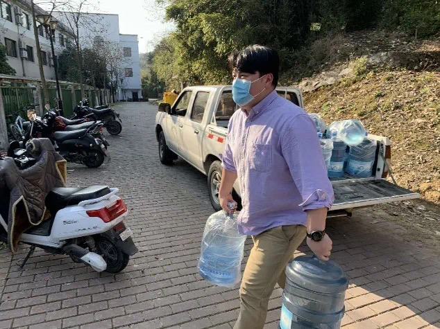 正在为留学生公寓送水的王强 公共区域消杀