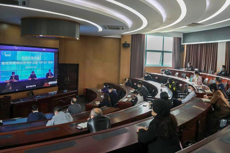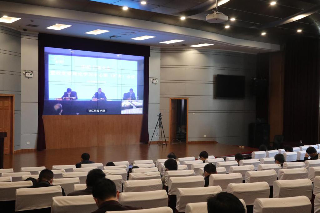 3月19日下午,学校举行干部大会暨校党委理论学习中心组(扩大)学习会。校党委书记龚建立传达近期习近平总书记对推进新冠肺炎疫情防控和经济社会发展工作作出的部署和重要讲话精神。校长赵东福就下阶段全校疫情防控和2020年学校事业发展各项工作作部署。会议由校党委副书记符宁平主持。校党政班子成员出席会议。根据疫情防控工作要求,会议采用主会场+分会场直播形式举行,全体中层干部、专职督查员、院长(主任)助理、专职党委委员、民主党派主要负责人等在各会场参加会议。