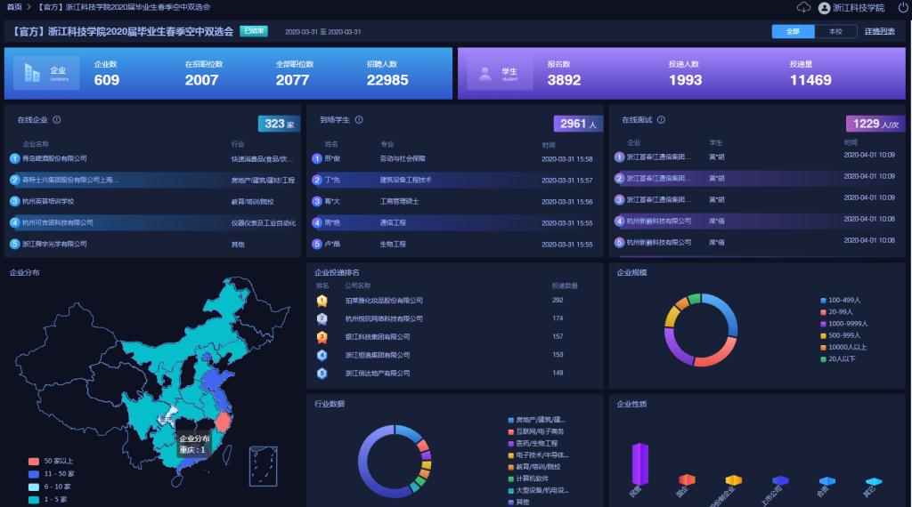 3月31日9点,浙江科技学院2020届毕业生春季“空中双选会”举行,609家用人单位线上揽才,提供岗位22985个,其中有上市公司44家,国企60家,事业单位10家,外商合资独资企业60家。
