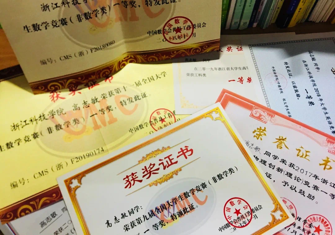高志敏喜欢数学,“给我们上《高等数学》的严永仙老师上课很棒。”上课时,他习惯坐在后面,但是对老师的每一个提问,他会在心里默默回答,巩固知识点。高志敏还坚持每年参加数学竞赛,三度获得全国大学生数学竞赛浙江省一等奖,浙江省高等数学竞赛一等奖和三等奖。对于那些“卡壳”的难题,高志敏会对着解题过程分析,为什么会想到这步?怎么能做到这步?他说:“这就是做数学题的乐趣,一道道题目变得越来越熟悉,知识点记得也越来越清楚。”