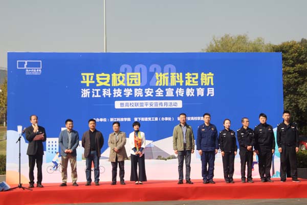 11月9日,“平安校园,浙科起航”安全宣传教育月暨高校联盟平安宣传活动启动仪式举行。校党委副书记周加敏、留下街道党工委副书记阮跃出席。杭州市公安局、西湖区公安分局、留下街道平安建设办、留下交警中队、留下消防、留下派出所领导,以及小和山园区各高校保卫处负责人,学校相关职能部门负责人,师生代表参加启动仪式。