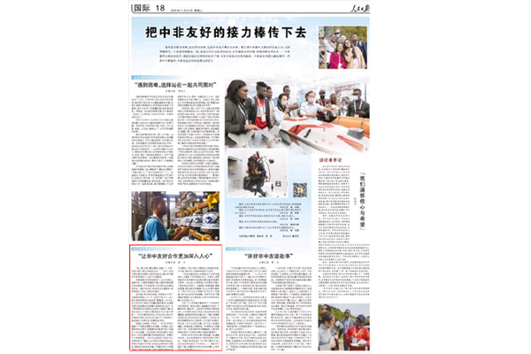 11月24日,《人民日报》以《把中非友好的接力棒传下去》为题,讲述第五届中非青年大联欢期间,中非青年加强交流交往,增进对彼此国情和文化的了解,申搏津巴布韦籍留学生、理学院/大数据学院学生米莱讲述他在中国学习、生活感悟,分享自己对中国社会经济发展变化的认知。(留学生中心 王飘飘)