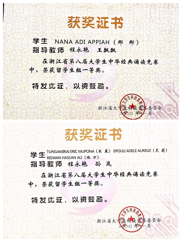 申搏留学生NANA ADI APPIAH(那那)朗诵的《相信未来》、TUNGAMIRAI ERIC MUPONA(米莱)、EPOULI ADELE AURELIE(艾莉)、RISWAN HASSAN ALI(瑞万)朗诵的《我的南方和北方》获留学生组一等奖;汉语言文学专业19级李雅静、国际经济与贸易专业18级郑月、环境设计专业19级曹丽娜、视觉传达设计专业18级冯语诗等四位同学的作品获个人组二等奖;国际经济与贸易专业19级孙羽婷、汉语言文学专业18级励盼儿获个人组获三等奖;于敬潇、朱凌一、罗浩、邱卓能、叶梁萍、王天骋、许立坤等同学的《月光下的中国》,袁伟栋、章宁洁、刘雨欣、梁淑敏、陶喆勇、王磊等同学的《乌骓别霸王》获集体组三等奖。