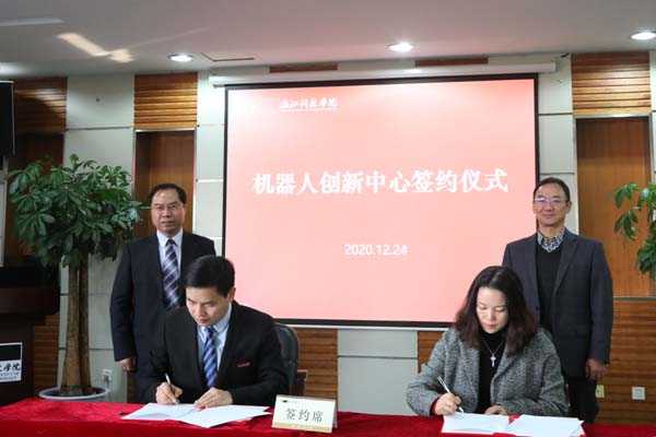 12月24日,学校机器人创新中心签约仪式举行,校长赵东福、副校长冯军,杭州市机器人协会秘书长、浙江国自机器人技术有限公司副总裁朱玲芬等出席,学校各职能部门负责人,电气学院领导班子与教师代表参加本次仪式。