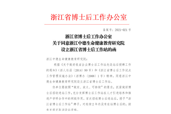 近日,浙江中德生命健康教育研究院获得省博士后工作办公室批准,成功设立申搏首个博士后工作站。